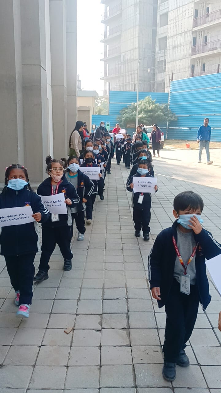 The day began with an energetic pollution-awareness rally, where children confidently wore their masks and held awareness pamphlets. Guided lovingly by student volunteers from Grades 6 and 7, the children formed a cheerful parade, enthusiastically chanting the slogan “Clean Air, My Birth Right!” Their voices echoed through the park, spreading a powerful message about protecting the environment.