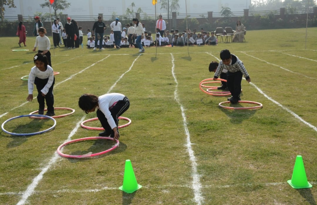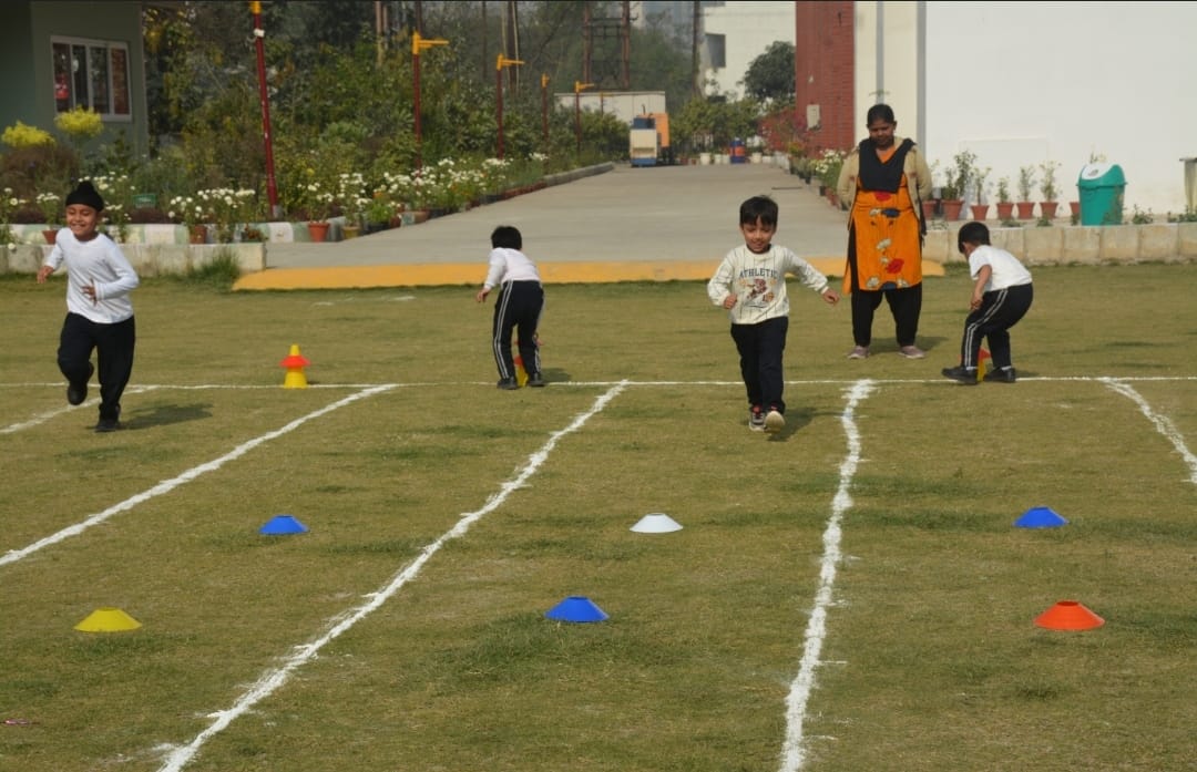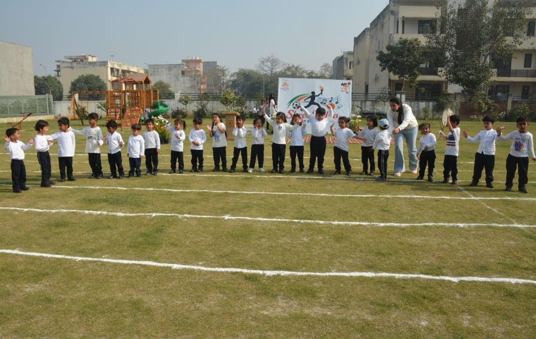 The event began with a warm welcome by the student anchors — Drishti Singh, Nancy Sharma, and Aarna Sinha — followed by the ceremonial lighting of the lamp and the School Sports Anthem. The Principal , Mrs. Soma Singh addressed the gathering and marked the inauguration. In her address, the Principal emphasized the importance of sports in building physical strength, discipline, confidence, and overall well-being among students.